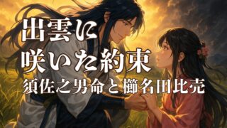 須佐之男命と櫛名田比売の物語は、八岐大蛇退治の後に結ばれた愛と再生の神話です。出雲の地で生まれた神婚は、日本神話の中でも最も美しい誓いとして語り継がれています。