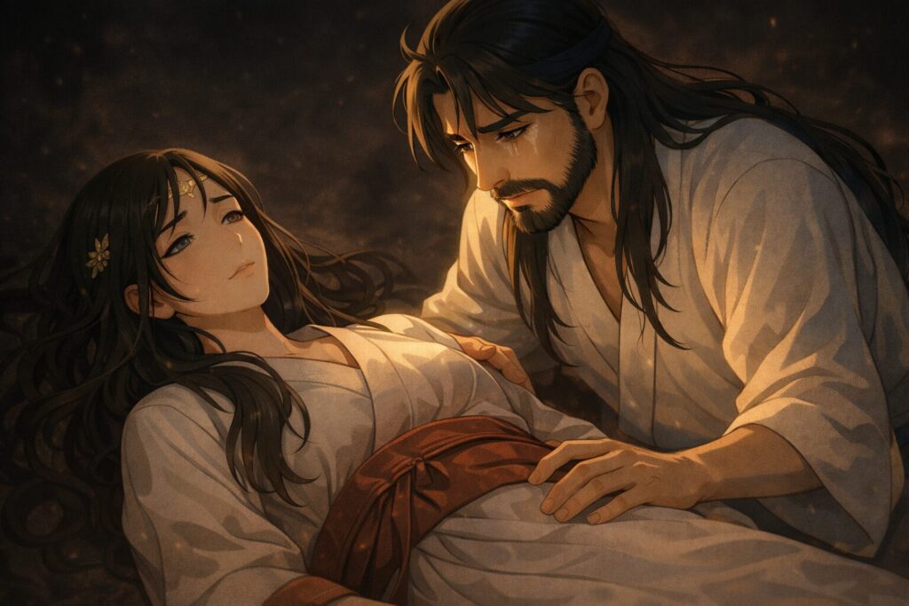 耐えがたい喪失に心を引き裂かれた伊邪那岐命は、ついに決意します。