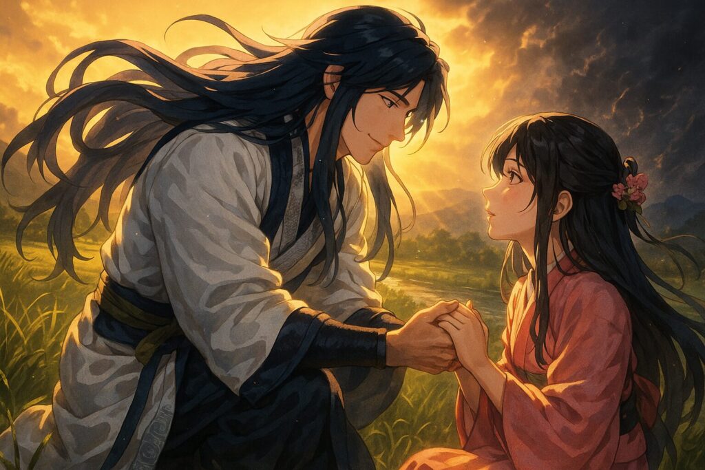 櫛名田比売は、小さく息をのみ、須佐之男命をまっすぐ見つめました。