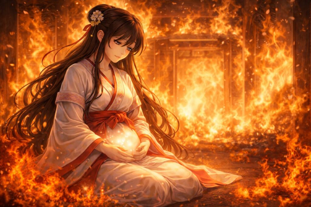 燃え盛る炎の中で、彼女は三柱の御子を産み落とします。