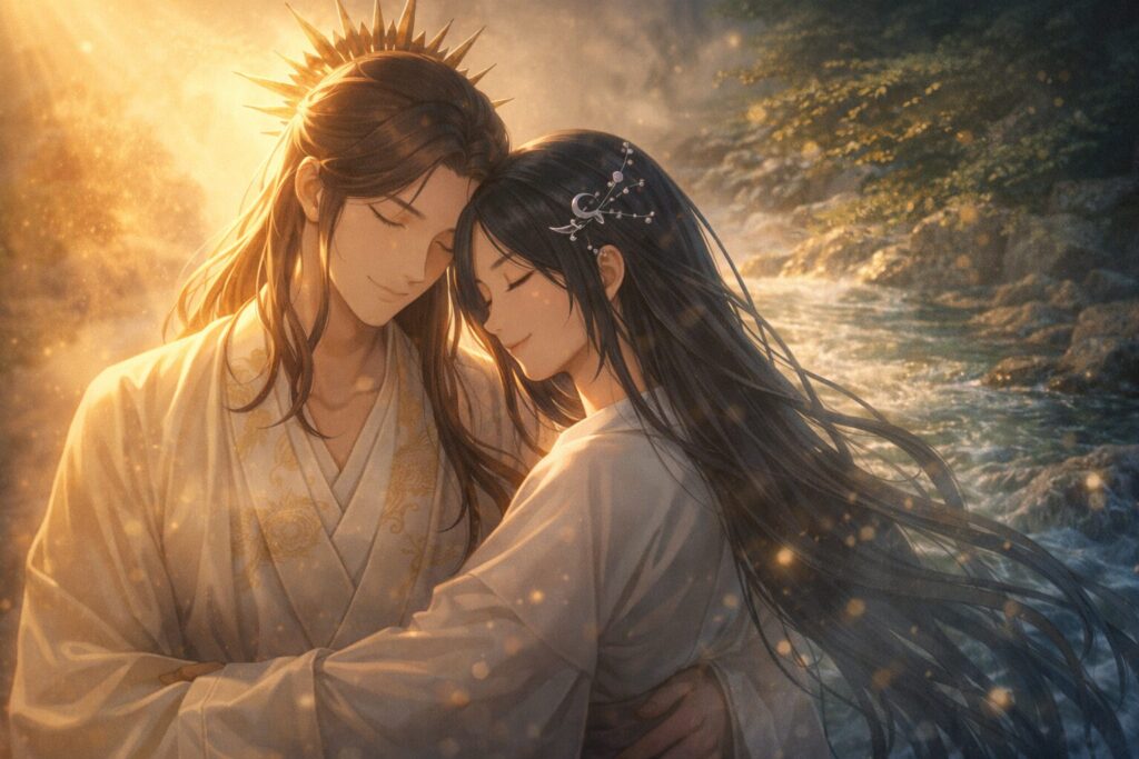 風がやさしく吹き、川の瀬が光を受けてきらめいていました。イザナギは衣を脱ぎ、その身を水に沈め、深く息を吐き出します。