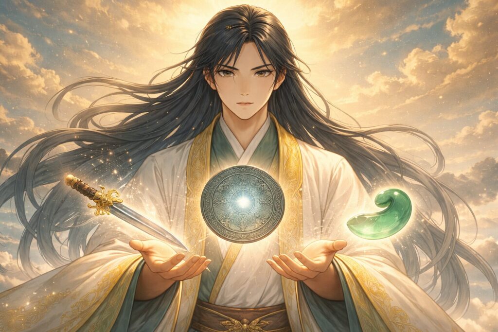三種の神器を携え、道を開き、やがて木花咲耶姫との婚姻を通して神々と人の世を結び直していく。